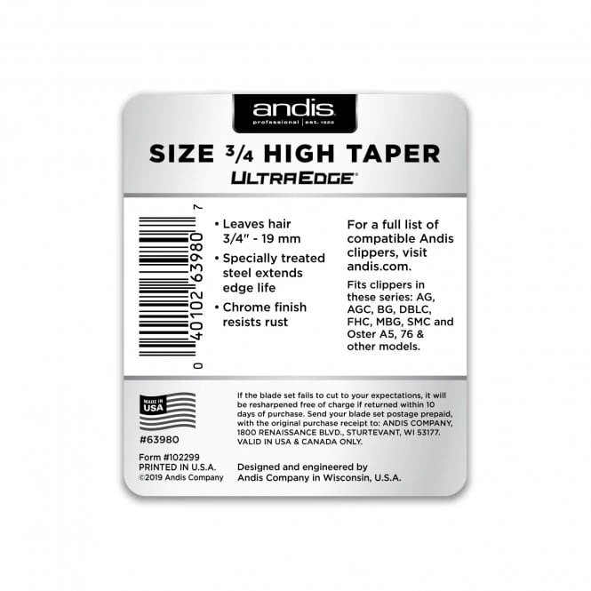 The Andis #3/4 High Taper UltraEdge Detachable Blade is made from carbon-infused steel to offer a harder cutting surface that stays sharper for longer. This quality universal replacement blade will fit any Andis, Oster or Wahl clipper with a snap-on blade mechanism.