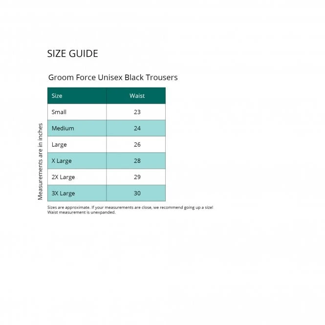 Groom Force black unisex trousers made from hair-proof, quick-dry nylon, with elasticated waist & generous cut for comfort. They are machine washable and available in 2 leg lengths, regular (31″) and long (34″).